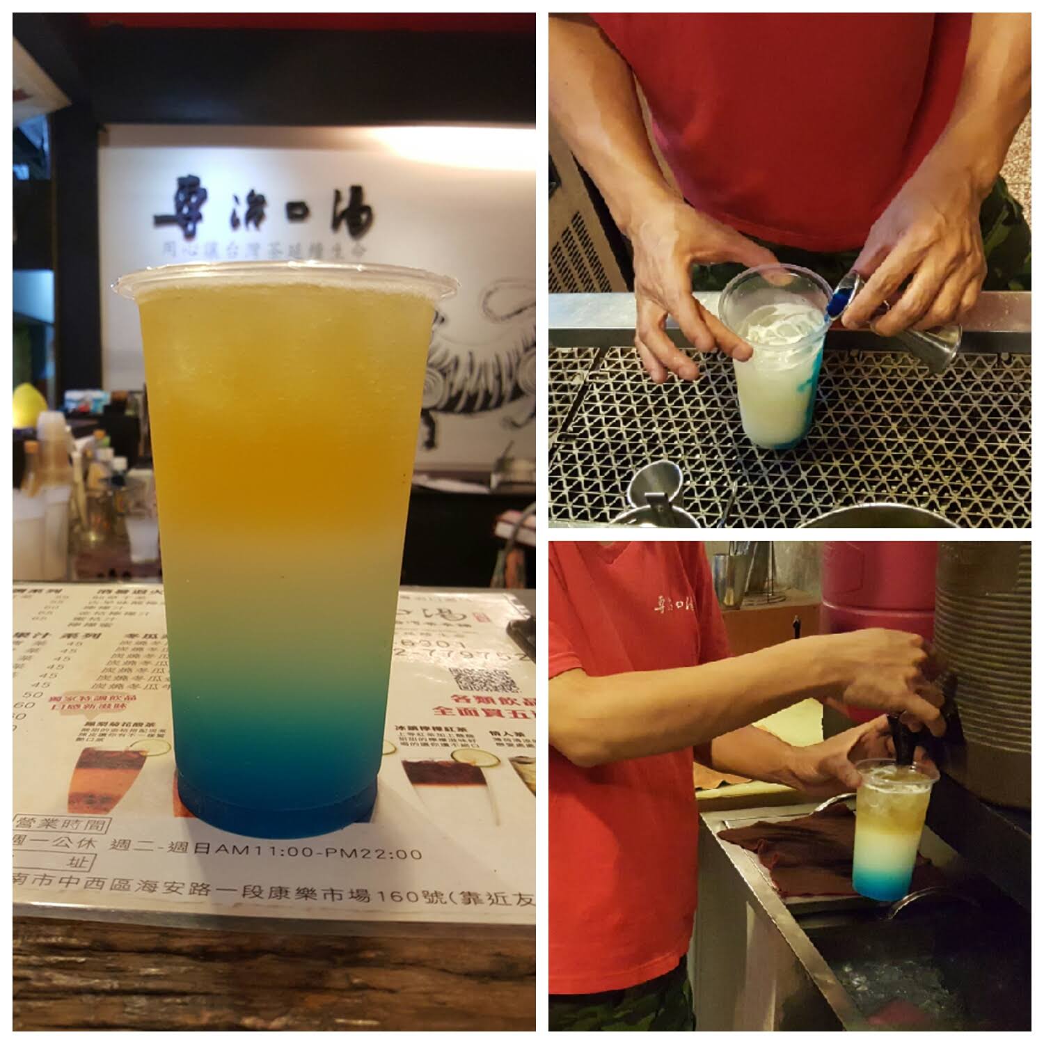 雖然老闆詳細解說了櫃台上的八杯漸層飲料,還有店裡暢銷的幾種飲品,但是種類真的很多,我一時眼花繚亂,於是直接請老闆端出最暢銷的款式-碧海藍天。據說這一杯從創店就在菜單上,十八年來歷久不衰。右邊是同行友點的今日老闆特調#4。
