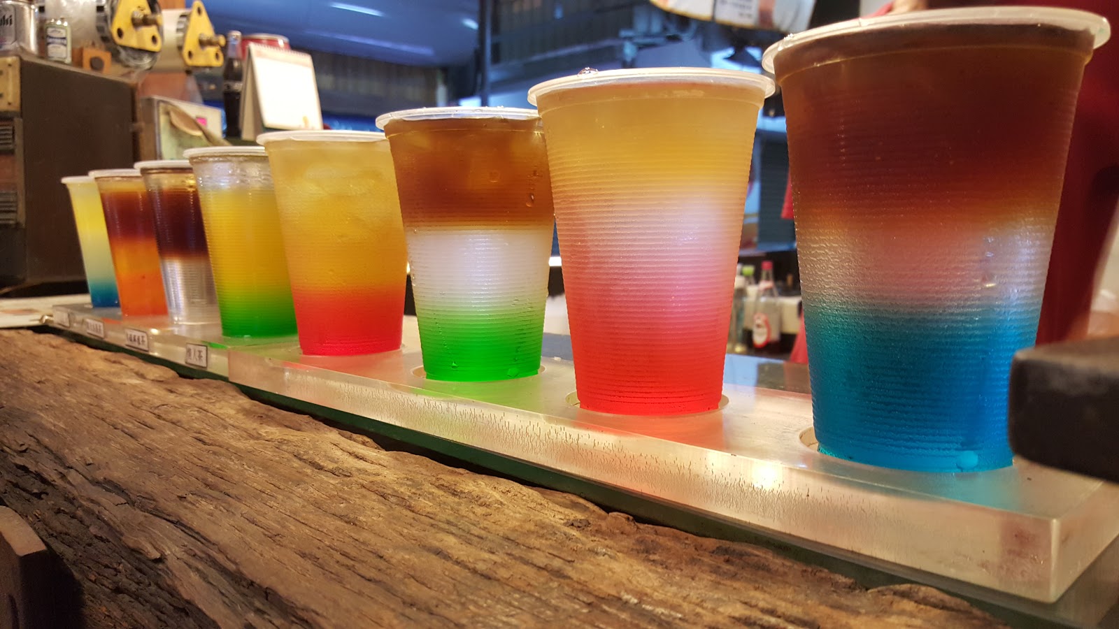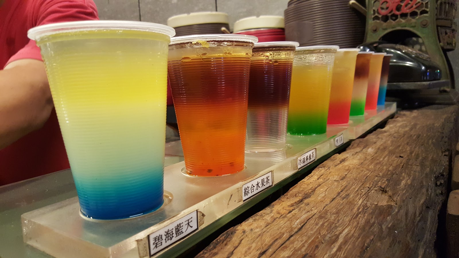 這天櫃台前擺的飲料一共八杯,左邊四杯有姓名貼,是店裡的熱銷飲料。右邊四杯是老闆特調,依據老闆心情每天會有不同的色彩,口味也是經過精心設計的。這樣一字排開拍起來真的好美,繽紛的晶瑩剔透看了就消暑。