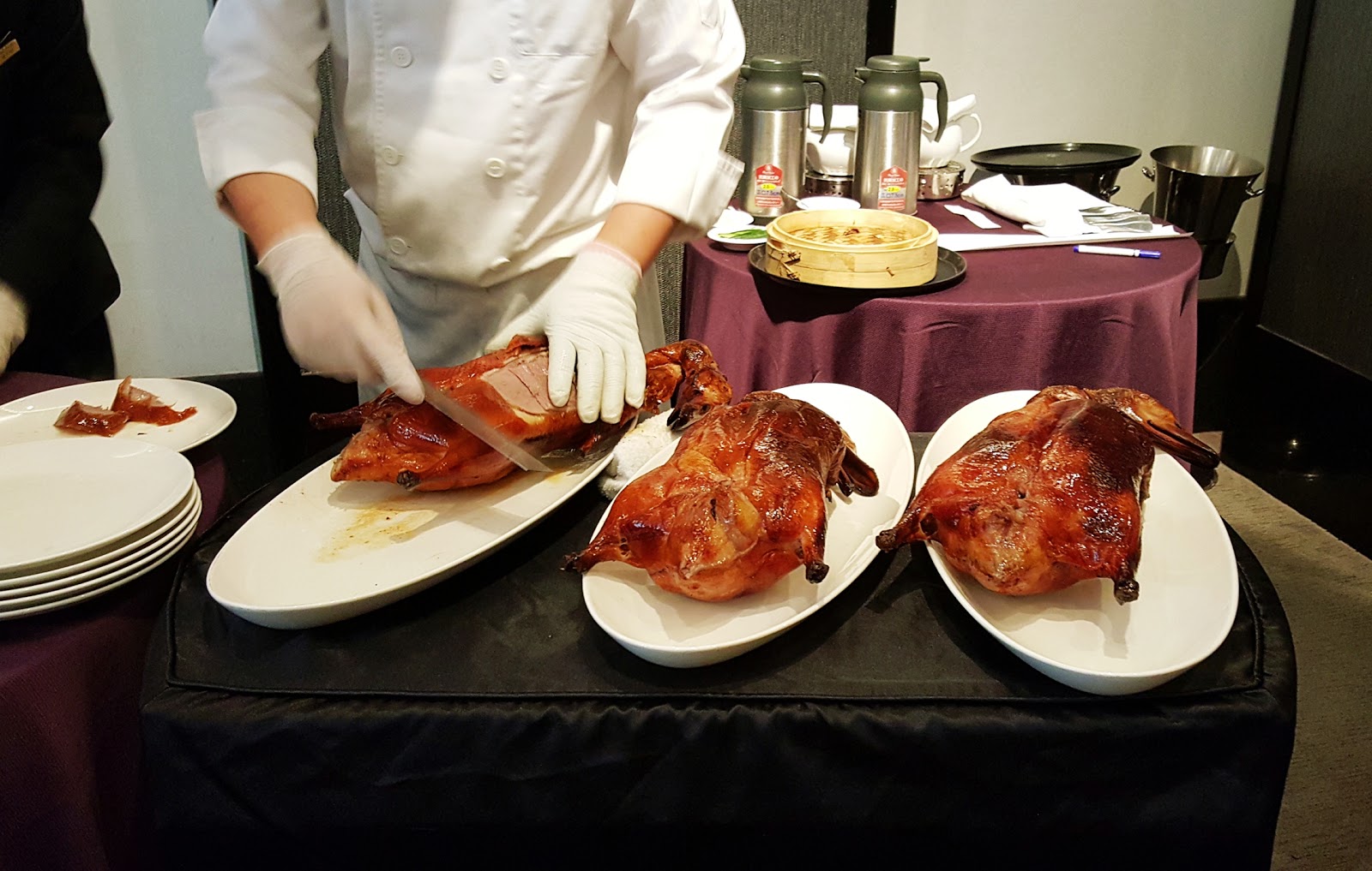 開胃菜上完之後立刻就是重頭戲,剛出爐烤得香噴噴的櫻桃鴨出現了!師傅桌邊片鴨秀,熟練的刀工片下等一下要製作鴨捲餅的鴨肉,每一片都要有鴨皮和鴨肉,大小也要差不多。