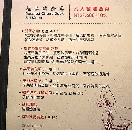 公司部門聚餐越吃越好,去年下半年度聚餐在老字號西餐廳「歐納牛排館」,這次選在台南晶英酒店晶英軒的「極品烤鴨宴」。晶英酒店選用每隻重約3.5公斤的宜蘭『櫻桃鴨』、以廣式掛爐的方式,細火慢烤出皮酥肉嫩、令人垂涎三尺的櫻桃烤鴨。
