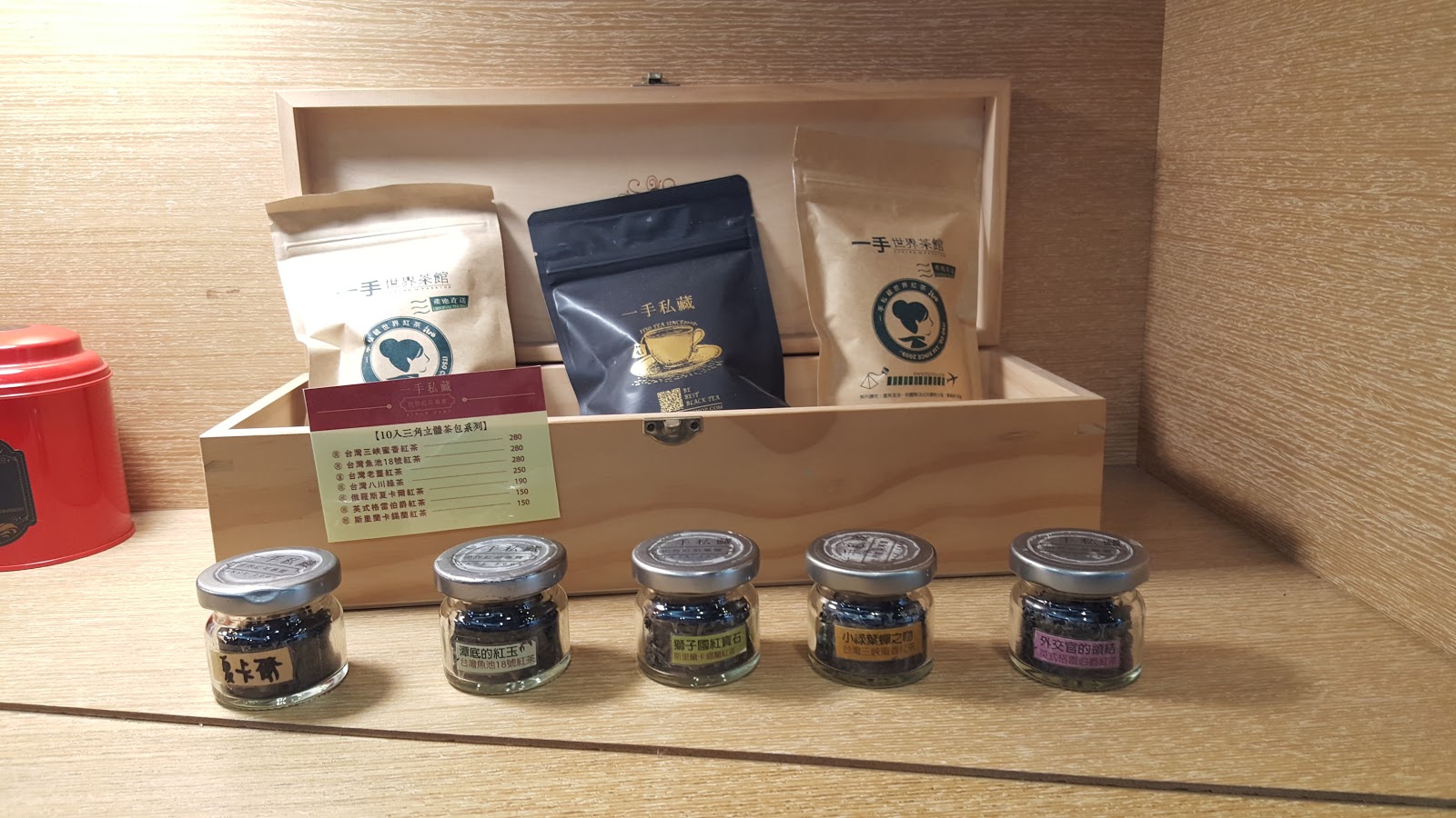 這組是散裝茶禮盒,有得獎的三峽蜜香紅茶、魚池紅茶、夏卡爾紅茶、伯爵紅茶和錫蘭紅茶。