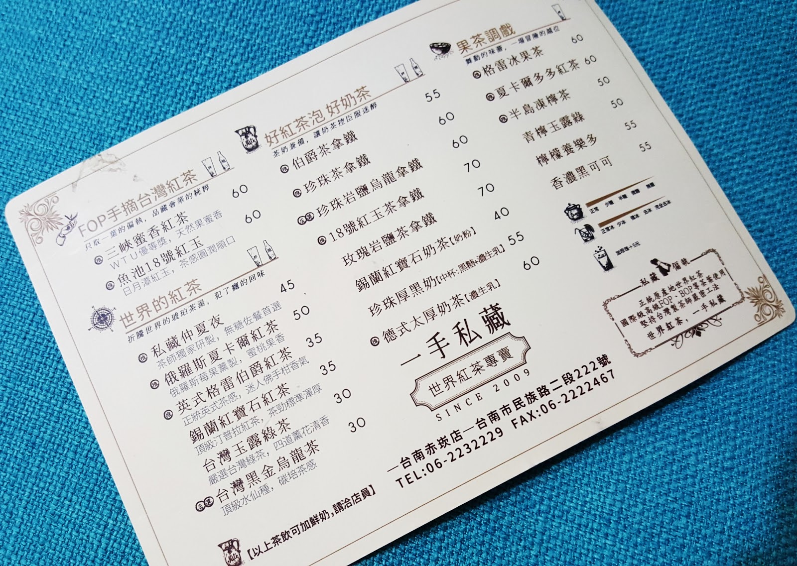 一級古蹟赤崁樓附近商圈也是台南美食的一級戰區,經過時間的淬煉,以及嘴刁的台南人去蕪存菁後,留下來的店家隨便走進去都不怕踩到地雷。「一手私藏世界紅茶」創立於2009年,走到今日正好十年。與一般手搖飲料店有些市場區隔,飲品種類不算多,強調「茶」本身的味道,每一種茶喝過一次就印象深刻。赤崁店店面不大,佈置的有些異國風情。