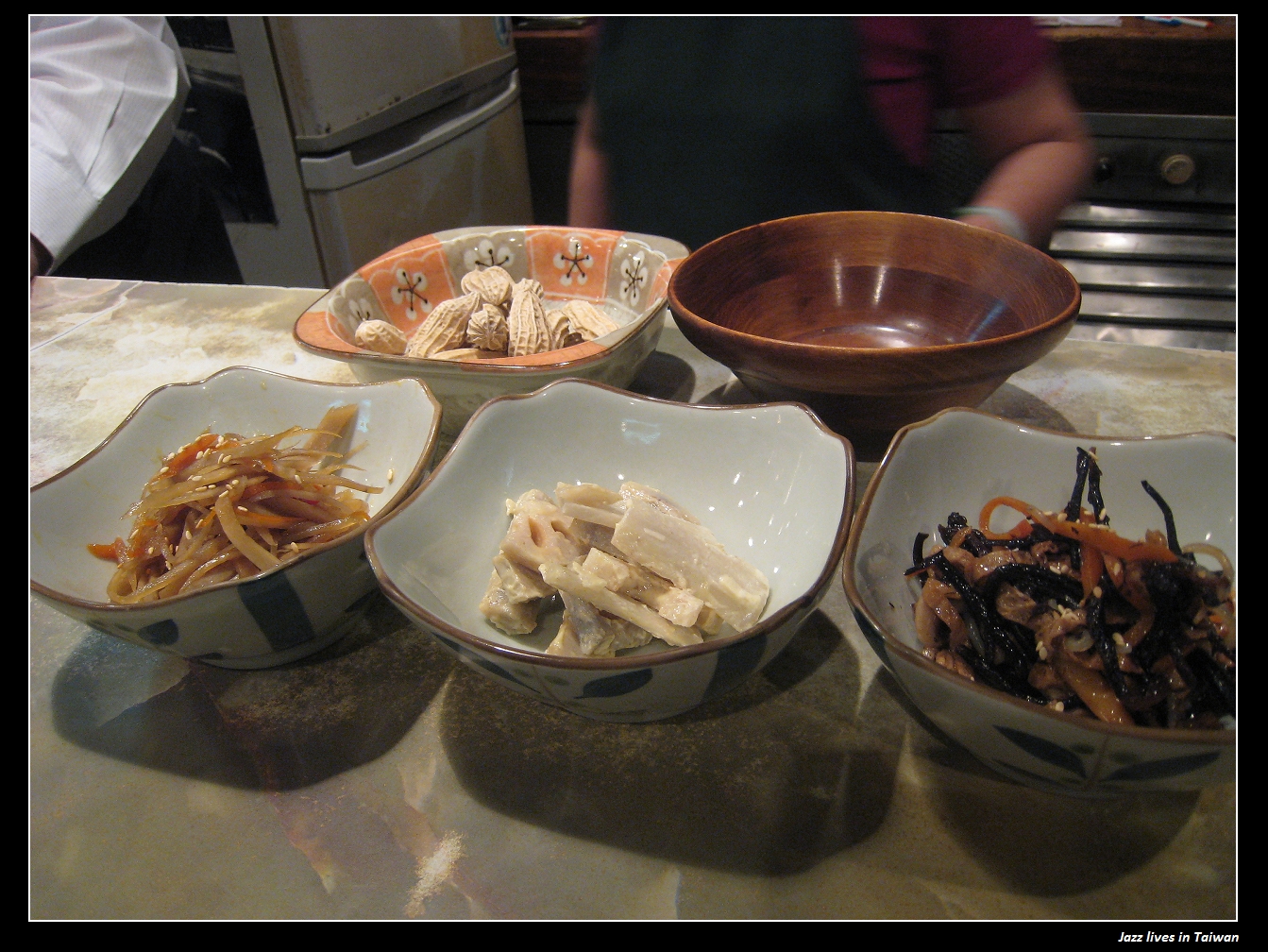 一坐下老闆就會先招呼好幾道可口的日式下酒小菜,