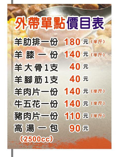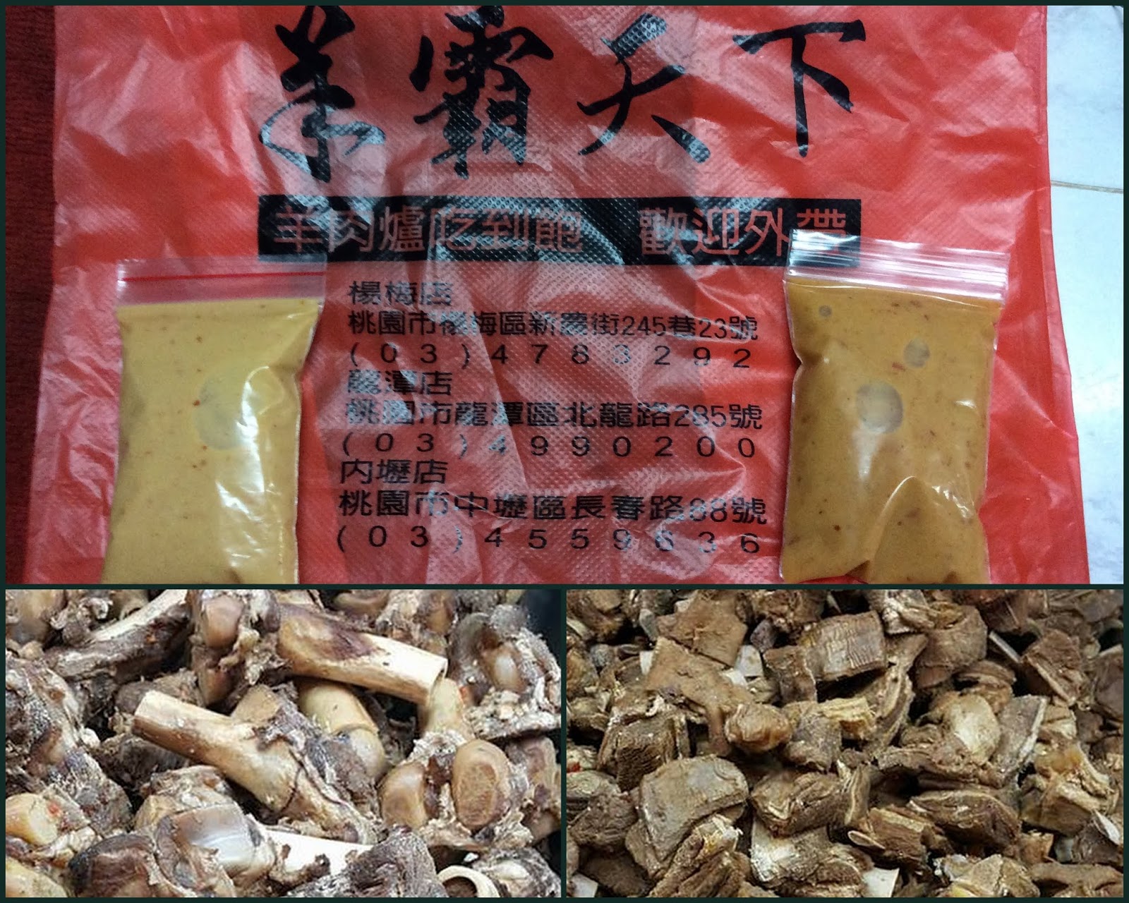 外帶羊肉爐有羊肉塊半斤、羊大骨1支、羊腳筋1支、