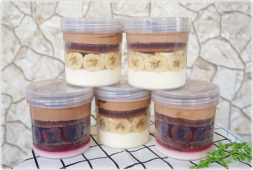 罐罐最底層是清爽的奶酪、再來就是香蕉、巧克力戚風蛋糕、巧克力慕斯、可可巴芮脆片
