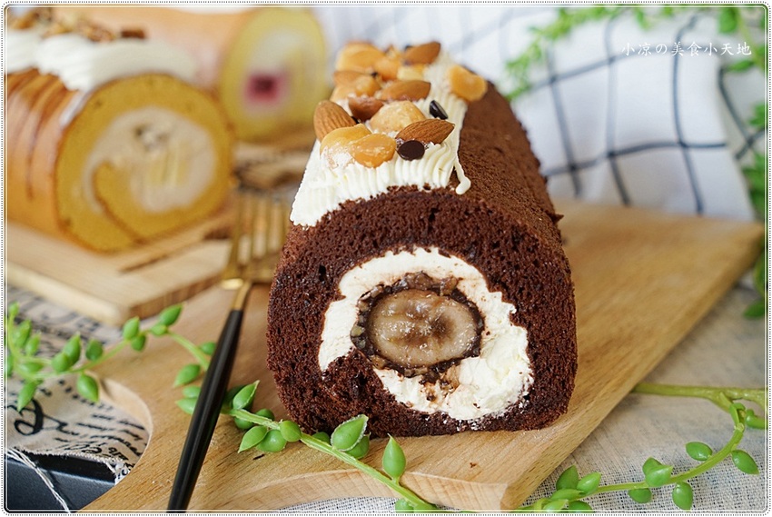 並在上層塗抹鮮奶油、撒上杏仁和夏威夷豆等堅果裝飾,就完成了這一款創新的巧克香蕉冰乳捲