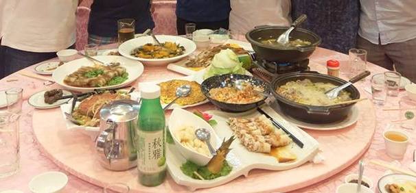 桌菜上得很快,遊覽車比預計的時間晚了半個鐘頭;團員們