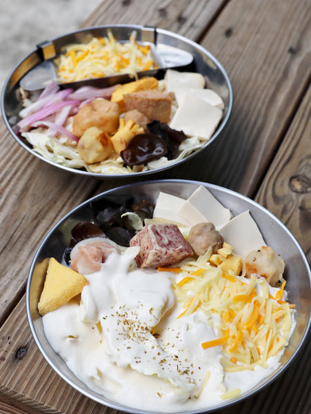 ▫️壽喜燒跟起司鍋都是我的心頭好,感謝小鍋裡讓他們在一起。鍋物附的蔬菜盤有青江菜、金針菇、豆皮、玉米筍、蟳味腿等,一鍋沸騰的壽喜燒,濃濃的香氣,淡淡的甜味,放入起司小盤中裹滿金黃牽絲的起司再入口,化不開的濃郁感通通轉成飽足。