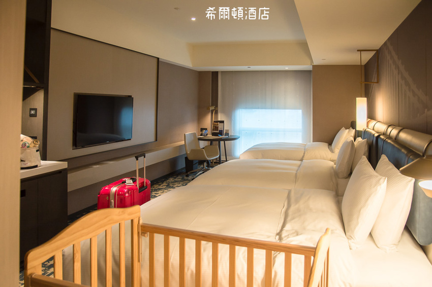 三人房的房型超大的,裡面放了三張單人床,雖然說是單人床,但我跟兩個小孩睡兩張床還是綽綽有餘,不過飯店還是有給我們一張嬰兒床,我就拿來放在中間剛好擋住,這樣小孩就不會摔下床了,