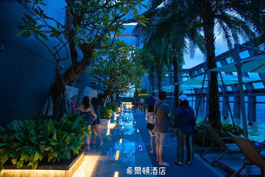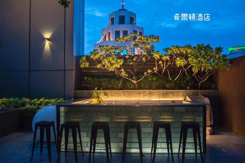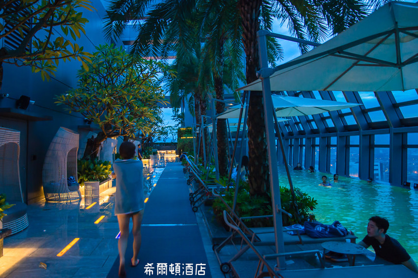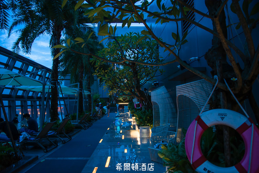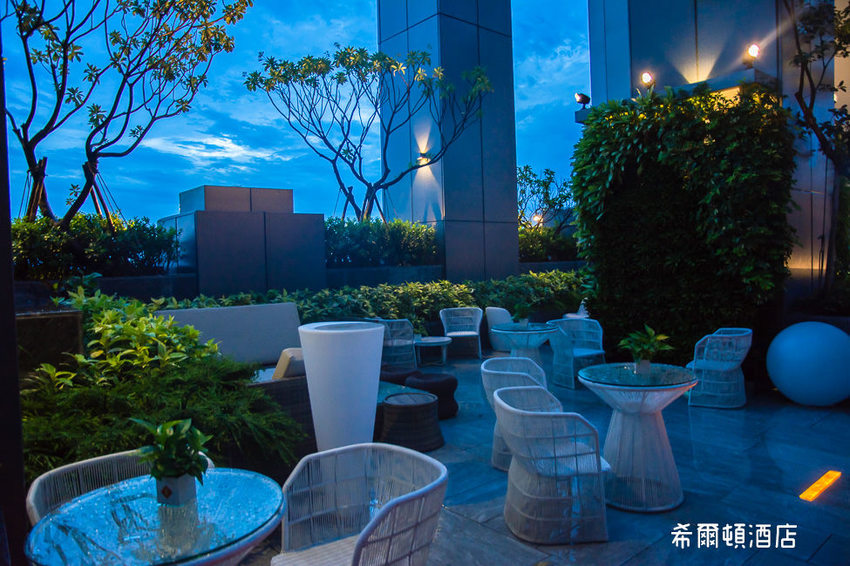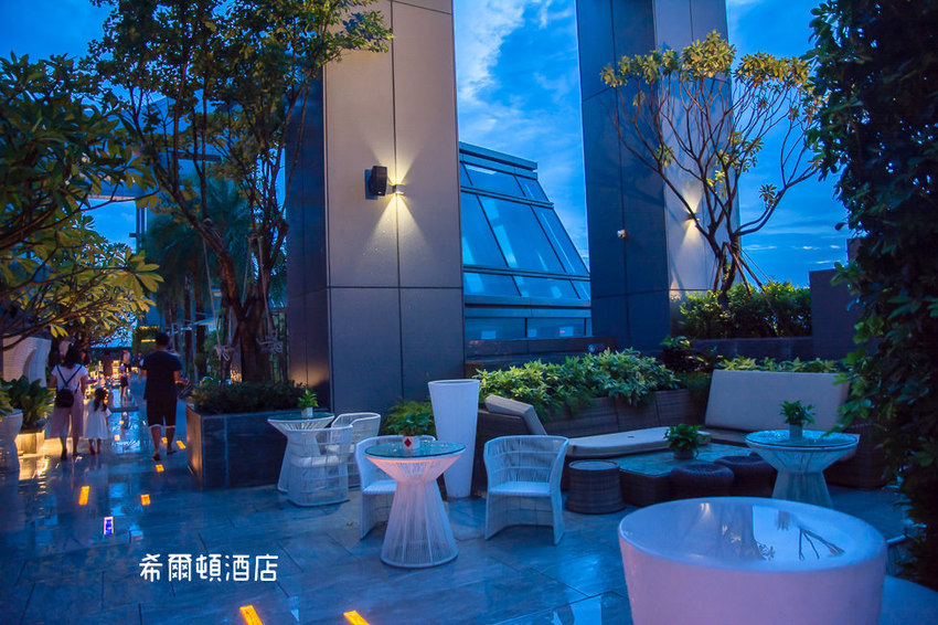 剛忘了介紹,泳池旁邊還有一小區塊座位區,可以在這裡和朋友聊天欣賞美景,覺得挺不賴的,可惜我們那次來遇到下雨天,就沒辦法好好坐下來放鬆一下,你們如果有來希爾頓,一定要上來頂樓走走啊!