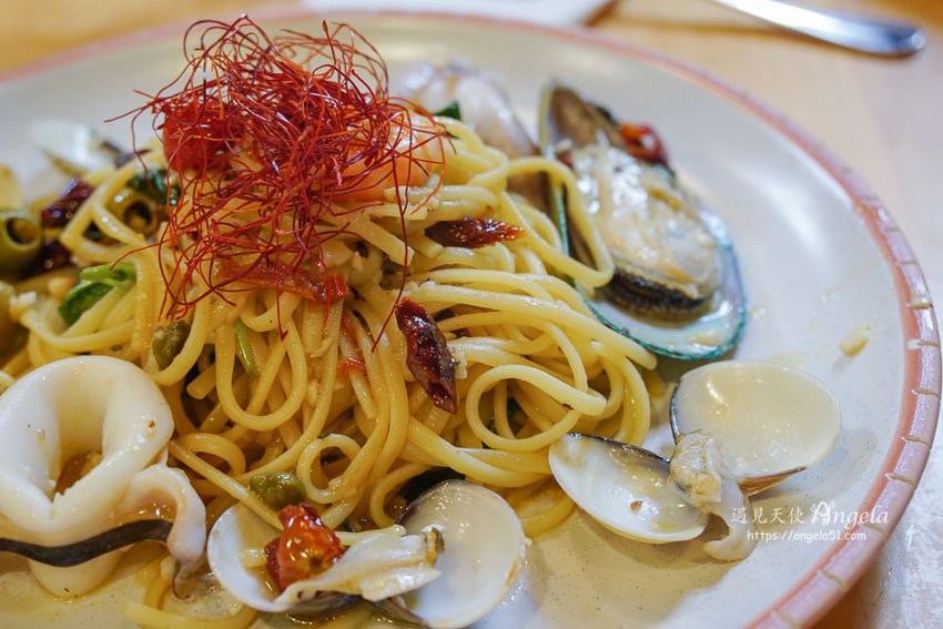 義大利麵,橄欖油為基本爆蒜香與海鮮拌炒,義麵吸飽海鮮鮮甜與蒜香,麵條彈Q好食。這道料理不會太辣,味道調和的很剛好,唯一困惱是吃完後盤子底部很多油。