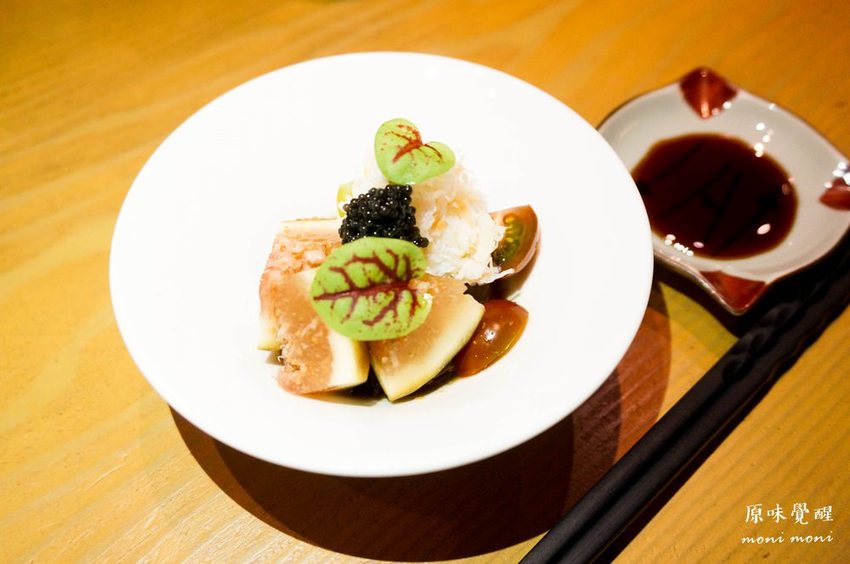 新鮮無花果搭配義大利蕃茄,以日本松葉蟹肉為主,上面放上黑色魚子醬,