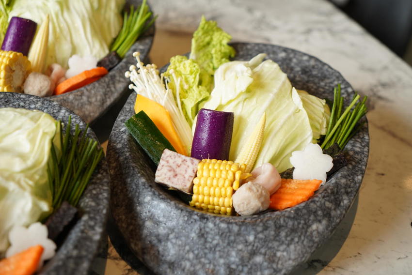 連菜盤都是大理石盤,怎麼可以這麼有質感啦!當天吃到的季節時蔬有高麗菜、水蓮、玉米、茄子、小黃瓜、南瓜、紅蘿蔔、白蘿蔔、玉米筍、大白菜、金針菇、芋頭,火鍋料則是有魚餃、米血、貢丸,整體來說真的非常豐富,份量上也很足夠!
