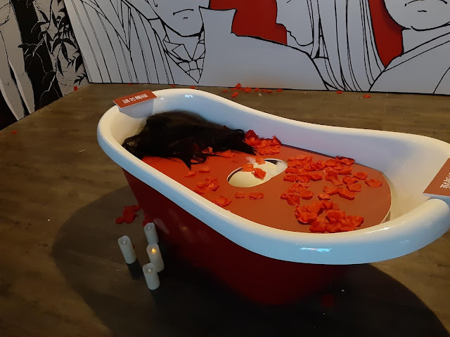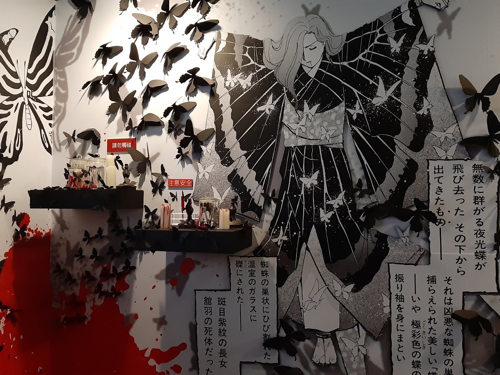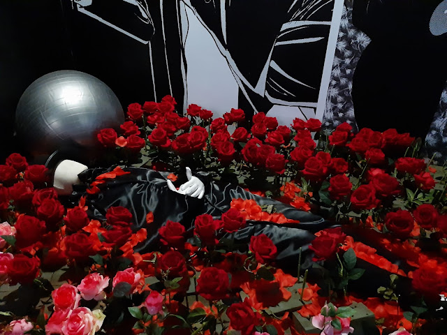整個展場佈置,如果害怕恐怖懸疑的朋友,確實會有不寒而慄的氛圍,但我好像沒這感覺,只覺得都做得滿精緻的,牆上的黑蝴蝶與玫瑰花是我有逗留仔細看的地方。