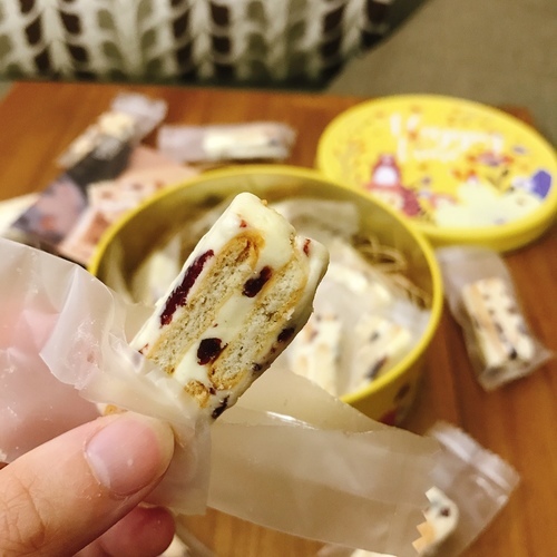 特色在於中間的兩層餅乾夾層,吃起來完全不黏牙,喜歡奶香和蔓越莓果乾香氣的結合,更重要是酥脆餅乾豐富牛軋糖的口感層次