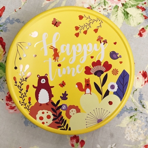 被鮮黃色的可愛鐵盒給吸引,鐵盒蓋上有可愛動物,棕熊、松鼠和兔子,還有些花草點綴,溫暖的鵝黃色讓我感到心暖暖