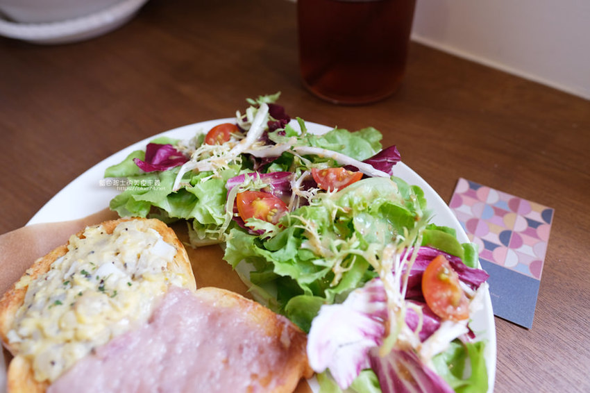 一旁附上野菜沙拉及飲品,飲品有紅玉紅茶跟美式咖啡可以二選一,更換飲品折抵50元。