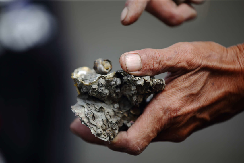 大哥介紹蚵苗養殖方式,分析雲嘉南養蚵和芳苑王功地區養蚵方式不同,「海牛」是早期彰化芳苑載運蚵農前往潮間帶採蚵的牛隻,