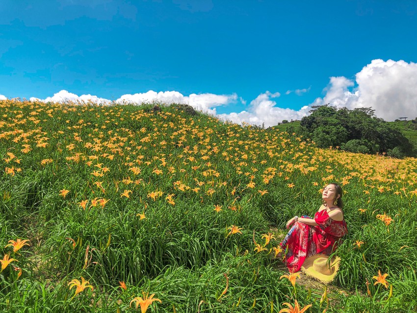 穿搭指南:Viki這次選紅色洋裝讓黃色金針和藍天白雲呈現高對比度!長洋除了可以防曬、躲避蚊蟲,隨風飄逸效果也很好!可以帶草帽、藤編包或是墨鏡都是很好用的配件,鞋子建議好走、不怕髒的鞋子(有時候會踩到爛泥)