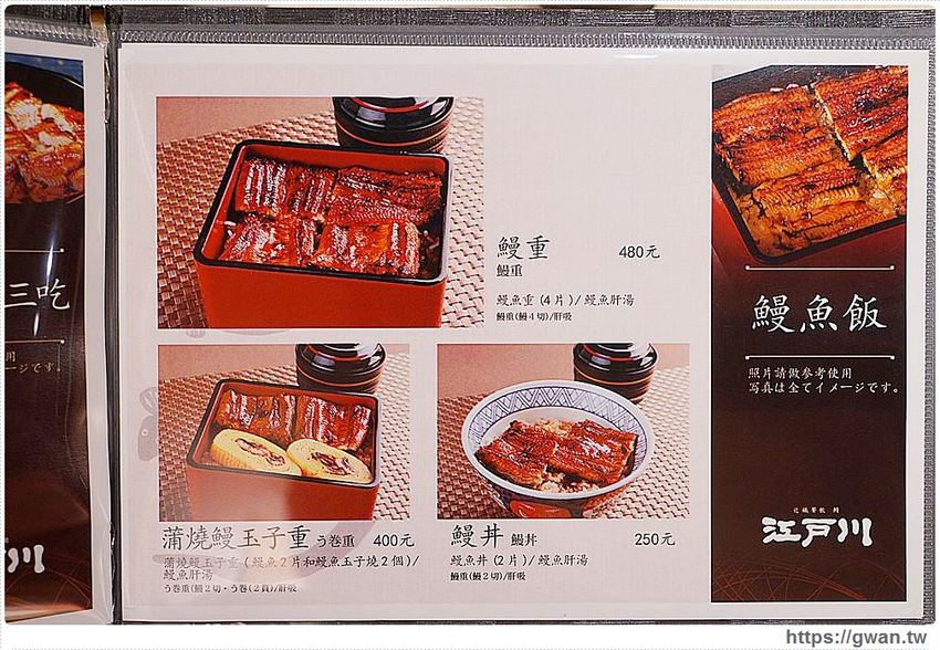 10/5開幕當天,鰻重、鰻丼、鰻魚飯三吃半價優惠(限量300份),像台中限定的鰻丼,只要125元就能吃到囉還免服務費,詳細菜單請參考 ▶▶ 江戶川鰻魚料理菜單