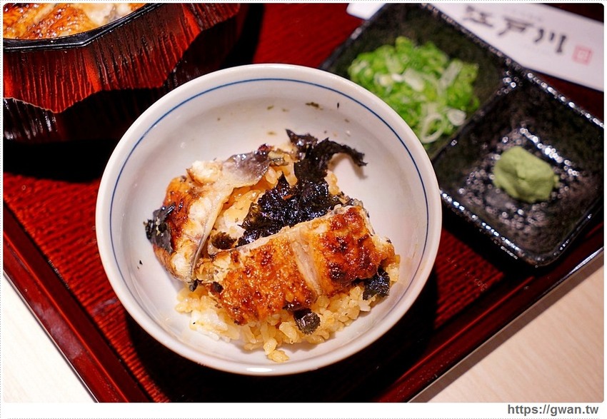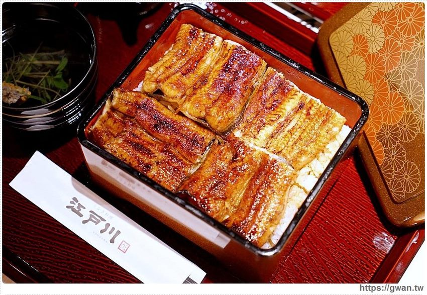 江戶川鰻魚飯使用當天現宰的國產鰻魚,肉質厚實而新鮮。鰻魚從背後切開,燒烤至白色再送入蒸鍋,之後再沾醬燒烤製金黃色,費工作法讓烤出來的鰻魚鬆綿軟嫩、香氣十足