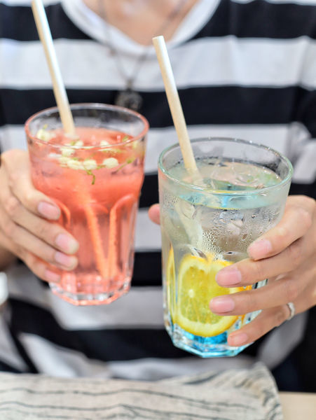 ▫️飲品今天選的兩杯都是氣泡飲,初戀西瓜呈現可愛的淡粉色,上頭還有些美美的食用花,適合女孩兒。濟州海洋哈密瓜底層為藍色, 兩杯入口都有滿清楚的水果風味哦。