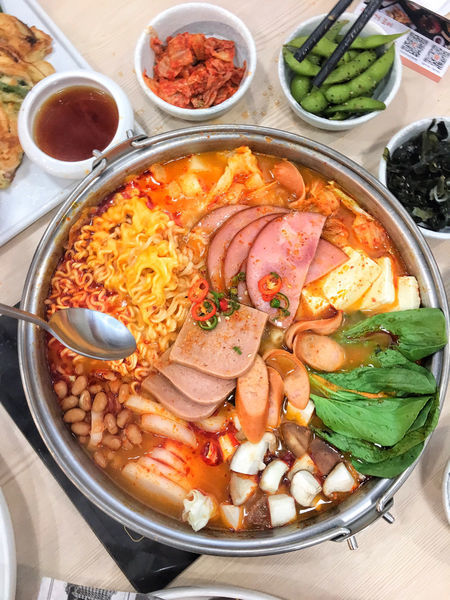 ▫️想吃鍋又想吃炸雞的話,滿推薦可以點套餐的。火鍋今天選的是火腿芝士議政府部隊鍋,有蔬菜、泡菜、豆腐、年糕、起司、三種火腿肉、蘿蔔、茄汁焗豆、韓國泡麵跟通心粉,運用多種不同食材特色,創造口感堆疊的變化層次,料豐味美。比較少見的的是焗豆、以及超適合搭起司的通心粉,辣度大約在小辣以上,喜歡重口味可自行加入小菜區的泡菜來調整。