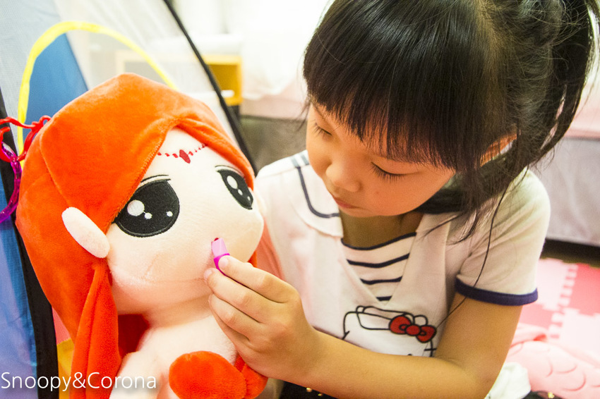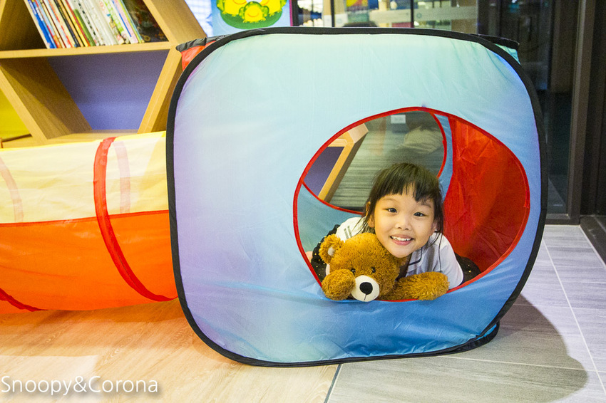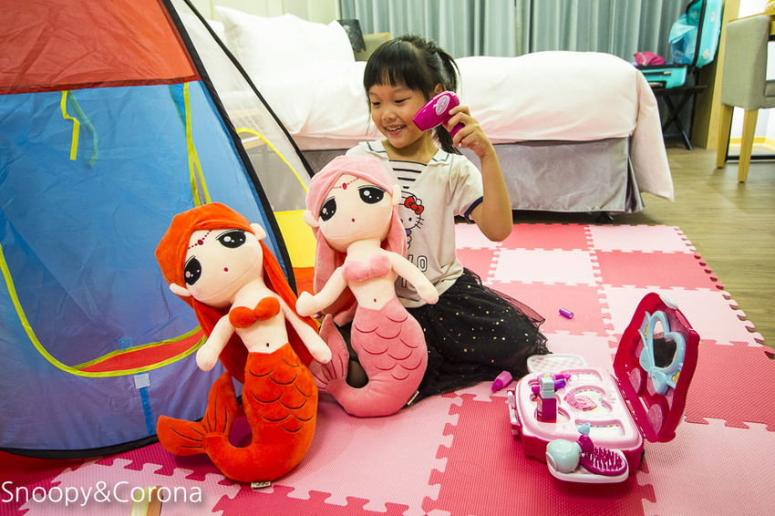 你看可樂娜一進房連背包都還沒放下就急著衝進兒童帳篷裡玩耍,