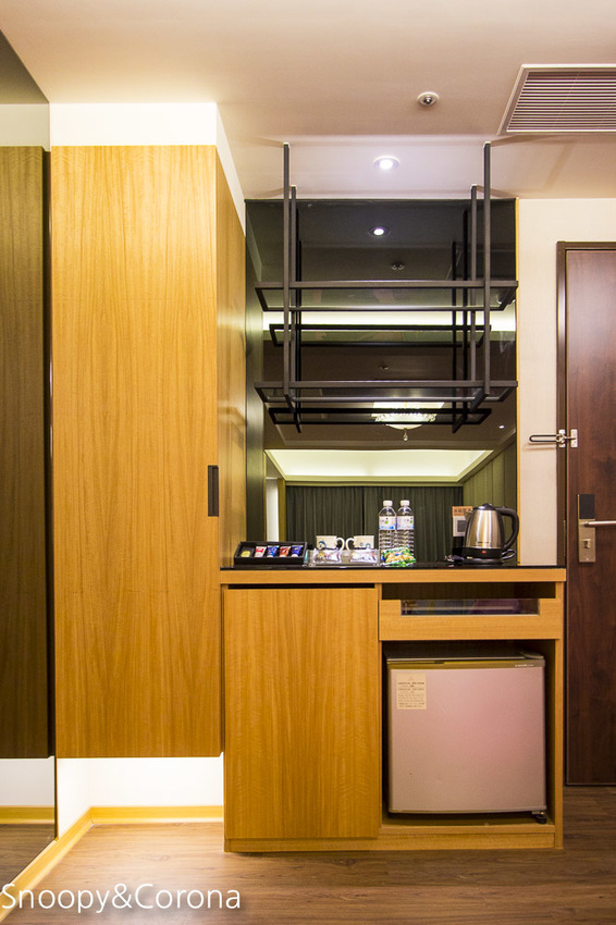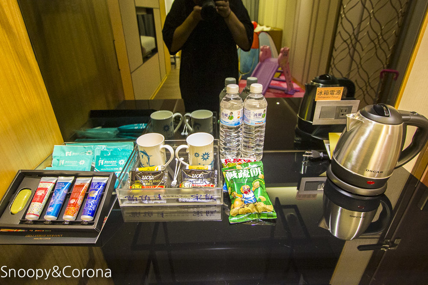 吧檯上備有熱水壺、馬克杯、瓶裝水、零食與沖泡的茶包和咖啡包