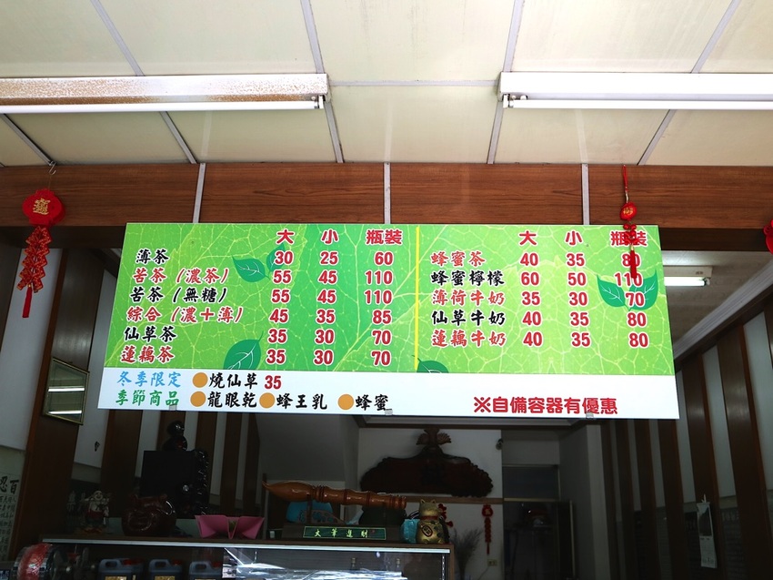薄茶、濃茶(苦茶)、仙草茶、蓮藕茶、蜂蜜茶…等,店家說都是民俗的降火飲品。