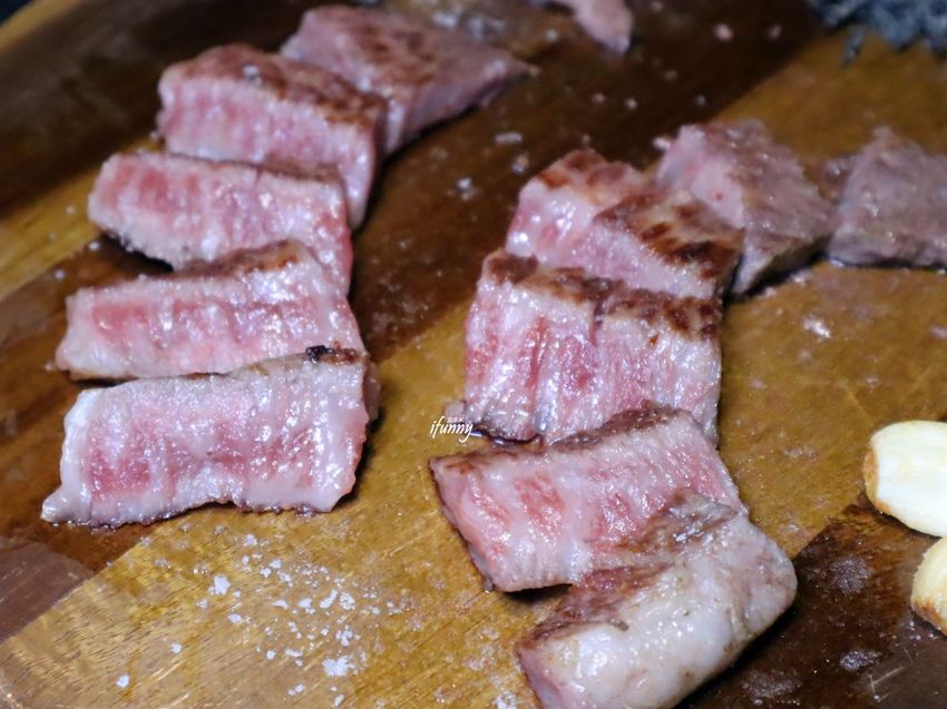 這約莫是沙朗心的部份,吃來略有嚼勁,搭配一旁的進口的脆大蒜,真的是美味到升天啊!