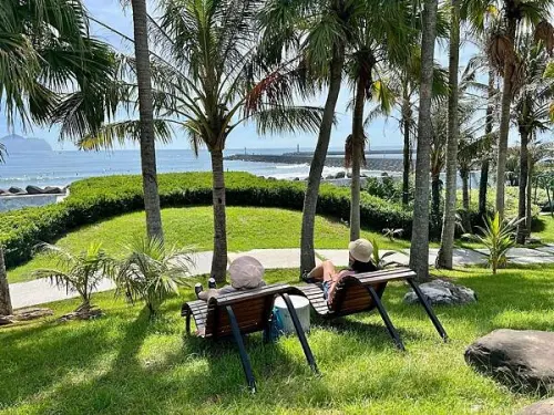 綠意盎然的草坪上有峇里風格涼亭,歡賞用的白沙,拍照地景,南洋熱帶植栽造景。從沒去過峇里島的我也能夠輕易的在台灣感受峇里島的度假風情。