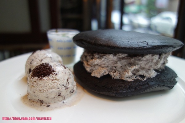 上下層是大量黑巧克力製成的厚實鬆餅體,中間夾著滿滿的OREO鮮奶油