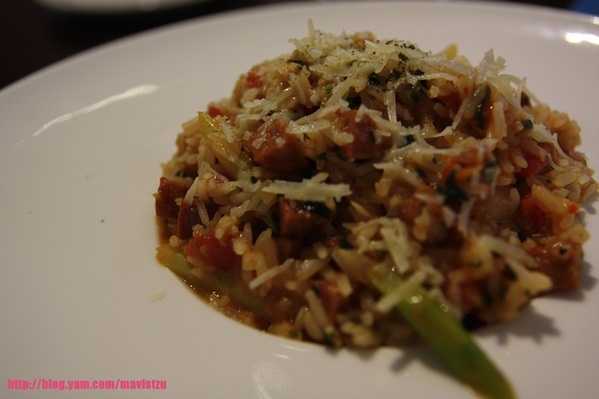 燉飯裡加入蘆筍及香腸去炒,炒到每顆米粒都均勻的裹上醬汁,確保客人吃到的口感都品質保證