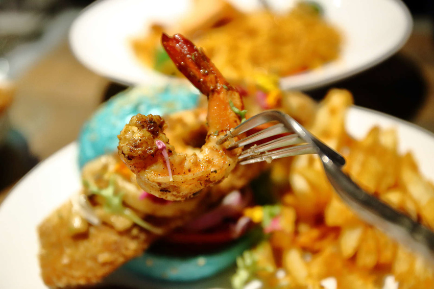 4.華麗珍珠美人魚漢堡(黃金魚排+草蝦+魷魚圈+鮭魚卵+香草塔塔醬+水藍色麵包)
