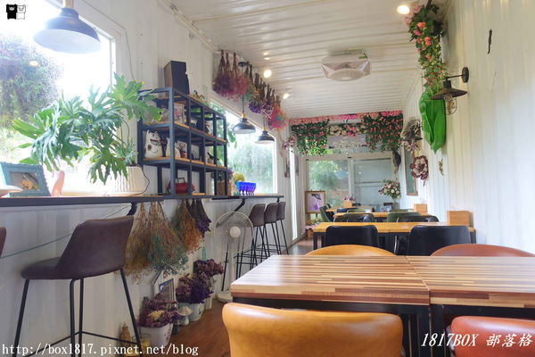 粉紅貨櫃屋在綠色庭園的襯托下特別顯目,店內裝潢走網美風,乾燥花,透明玻璃,每個角落都超好拍,