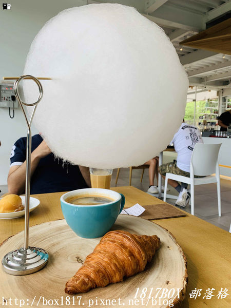 還有附一個可頌麵包,一邊品嚐著麵包,一邊喝咖啡,偶爾手撕棉花糖,很有趣的下午茶。