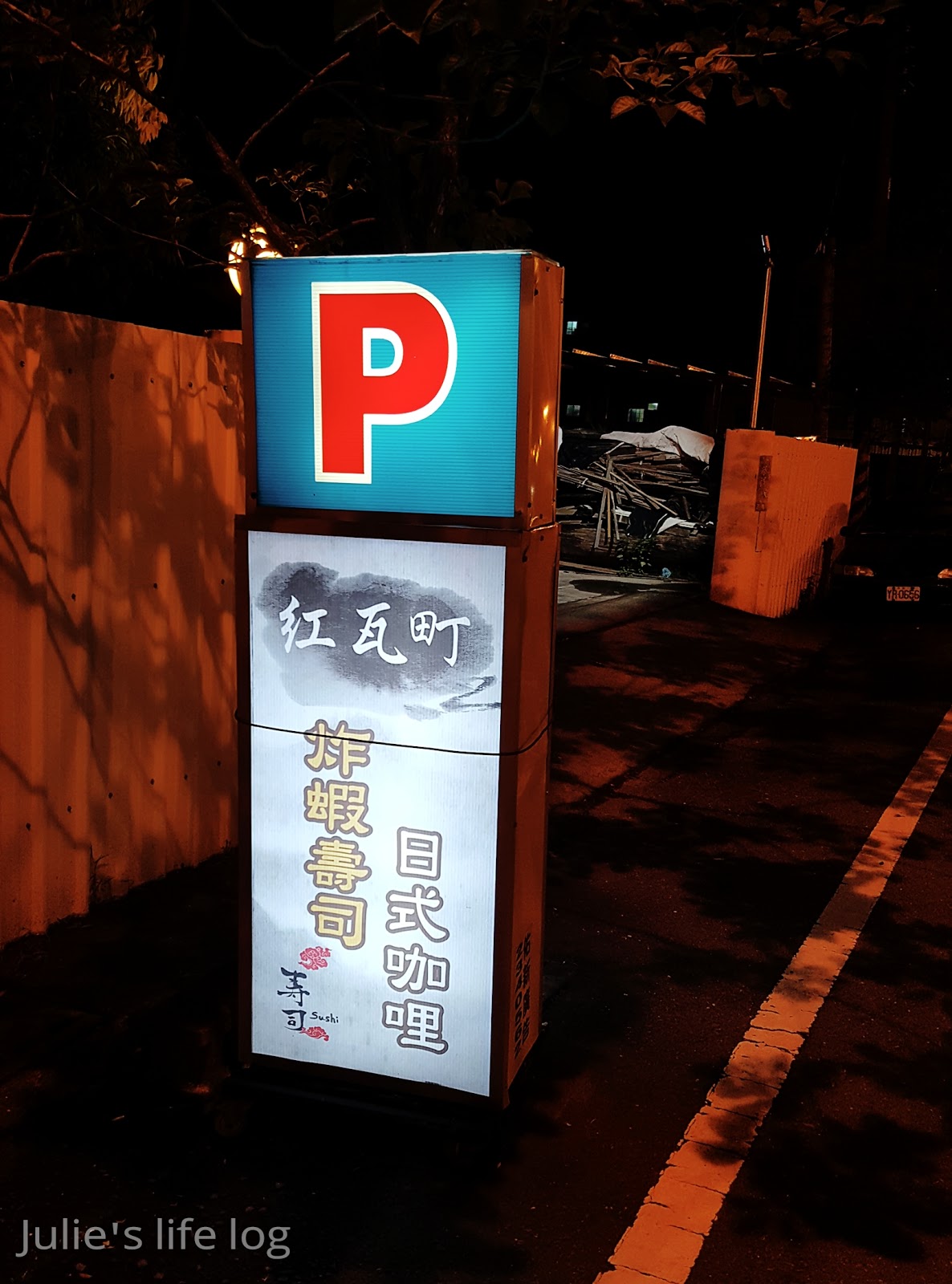 難得下班的時候天還亮著!「紅瓦町」位在新市比較外環的地方,附近還空曠的。旁邊也有專屬停車場,可以停約十幾台汽車,機車可以直接停在店家門口。