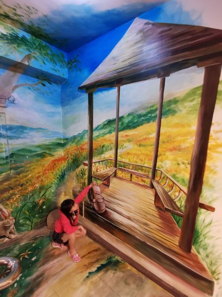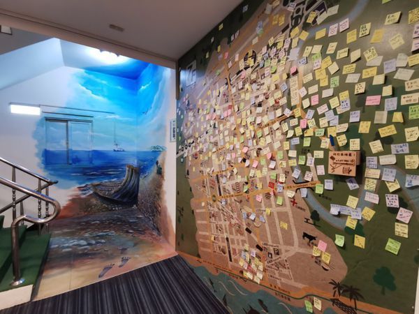 在樓梯間居然也有3D彩繪,樓層的牆面上那貼滿的便條貼底下似乎是花蓮地圖