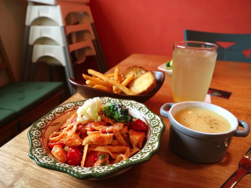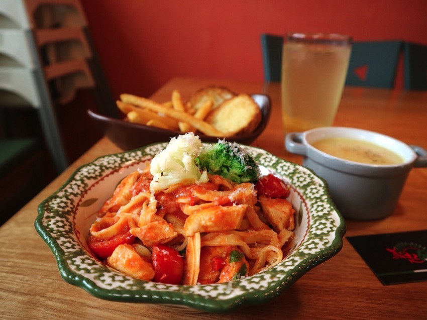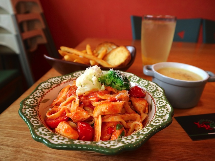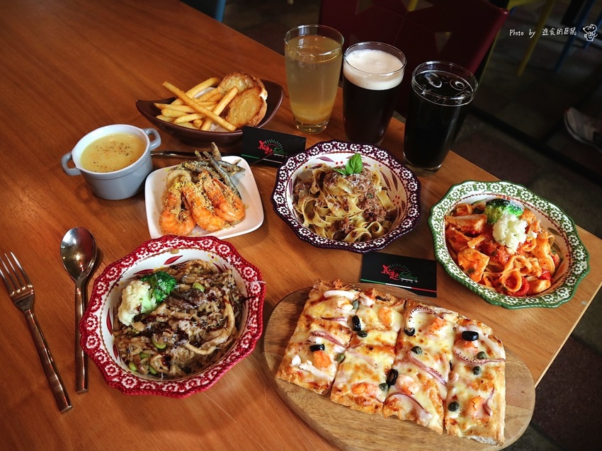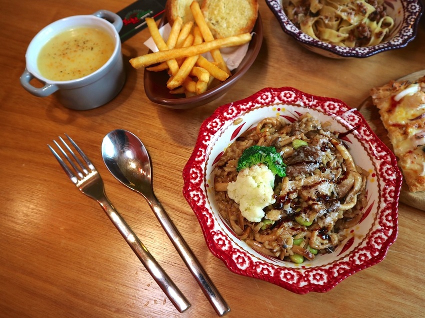 餐點平價,義大利麵& 燉飯為套餐的方式呈現,除了主餐,還附有蒜香麵包、濃湯、薯條、飲料,份量十足,小鳥胃女孩可是會吃不完呢!!!