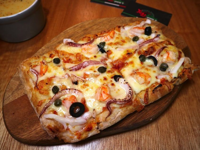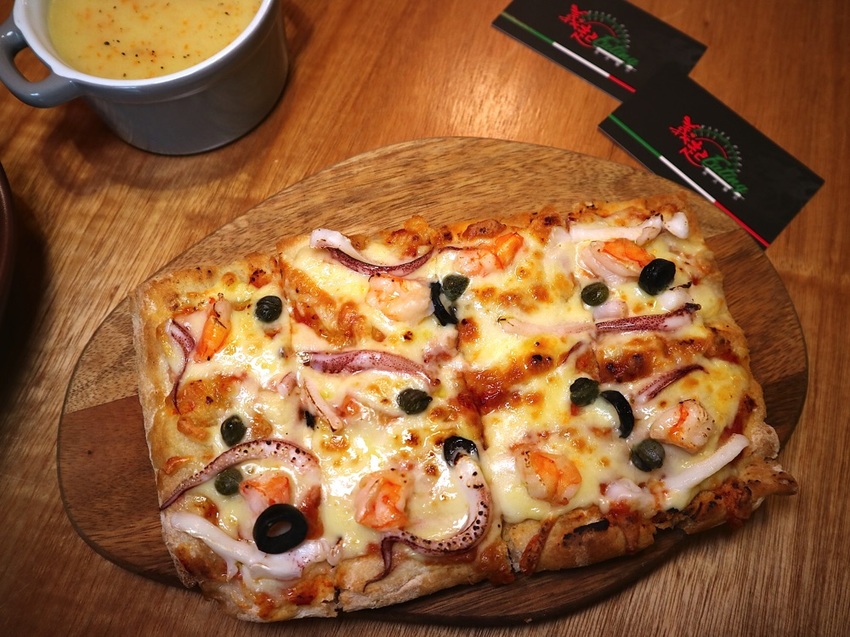 長方形的披薩,滿少見的呢! 用木盤盛裝,上方滿滿的海鮮料,有著異國的美食氛圍!