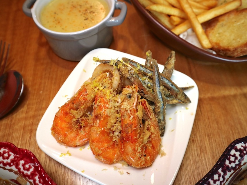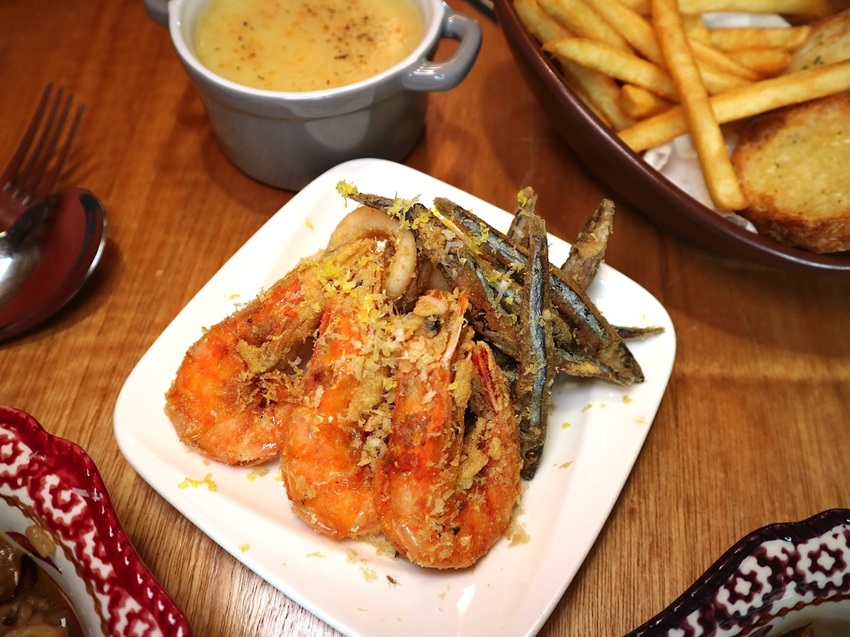 小盤裝的《炸海鮮》,香酥鮮蝦、炸魚、花枝圈 各三