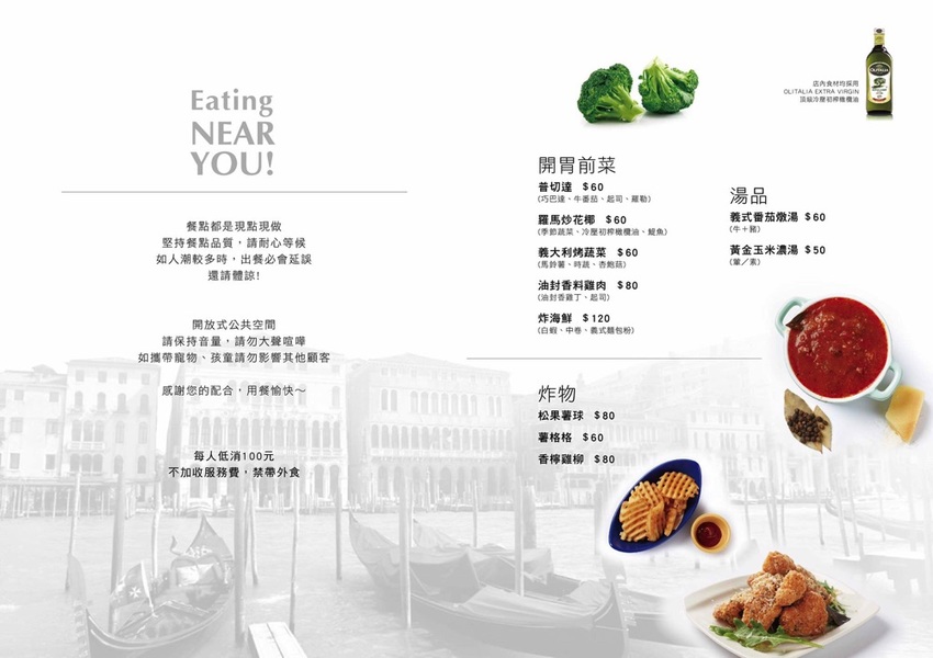 摒除掉坊間義大利麵店所用的醬汁加工品和調味劑、添加劑,我們只用到位的天然的食材、初榨橄欖油,不炫技也不奢華,是色、香、 藝的具體表現,將食材原有的風味表現出來,