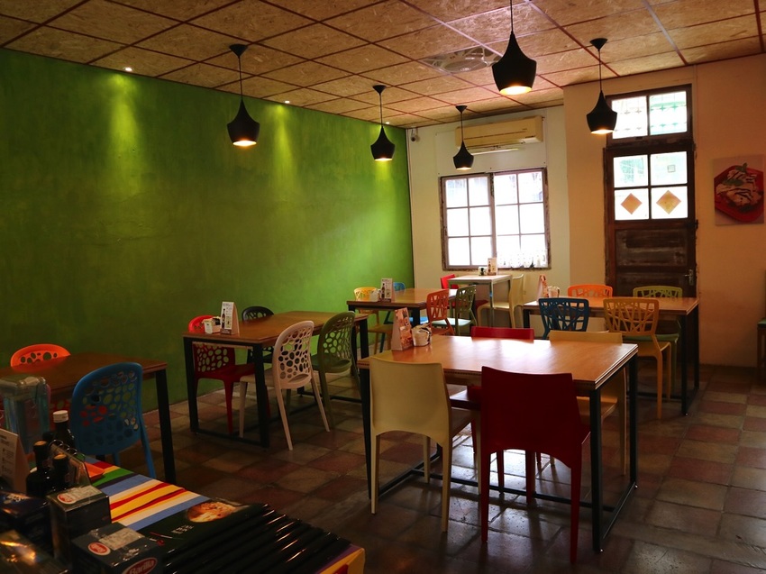 ▼這區的餐桌,我也很喜歡!!! 鵝黃色的牆面,有一塊斑駁,頭頂上的造型黃燈、木條鋪設的天花板、大面留有通氣窗的鐵花窗面,格外的有味道!!!