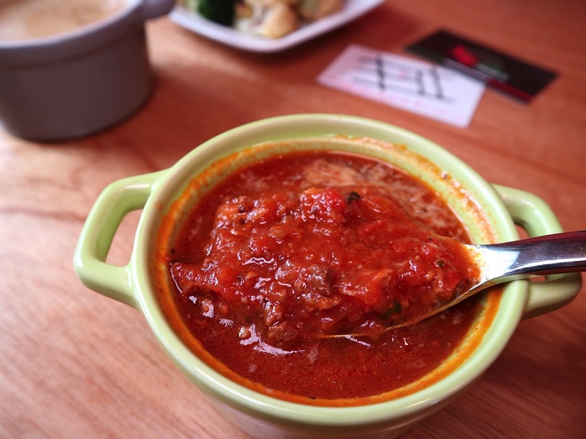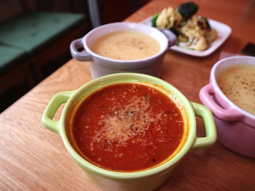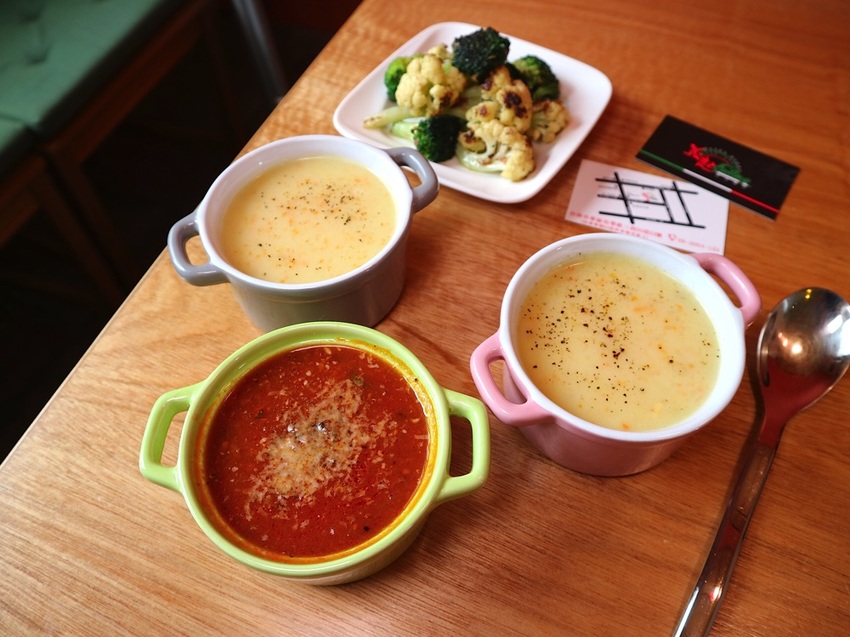 那天的濃湯有兩種口味:《義式蕃茄燉湯》、《玉米濃湯》,也能單點加購唷!
