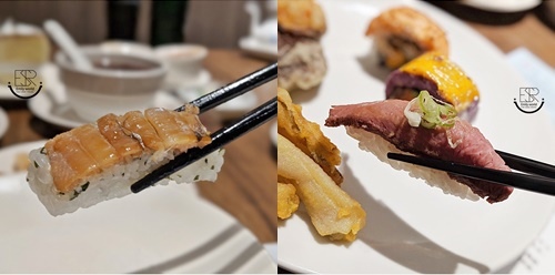 冷製錦秋牛肉壽司(右),上面那片牛肉真是很加分,整體顯得特別的嫩口