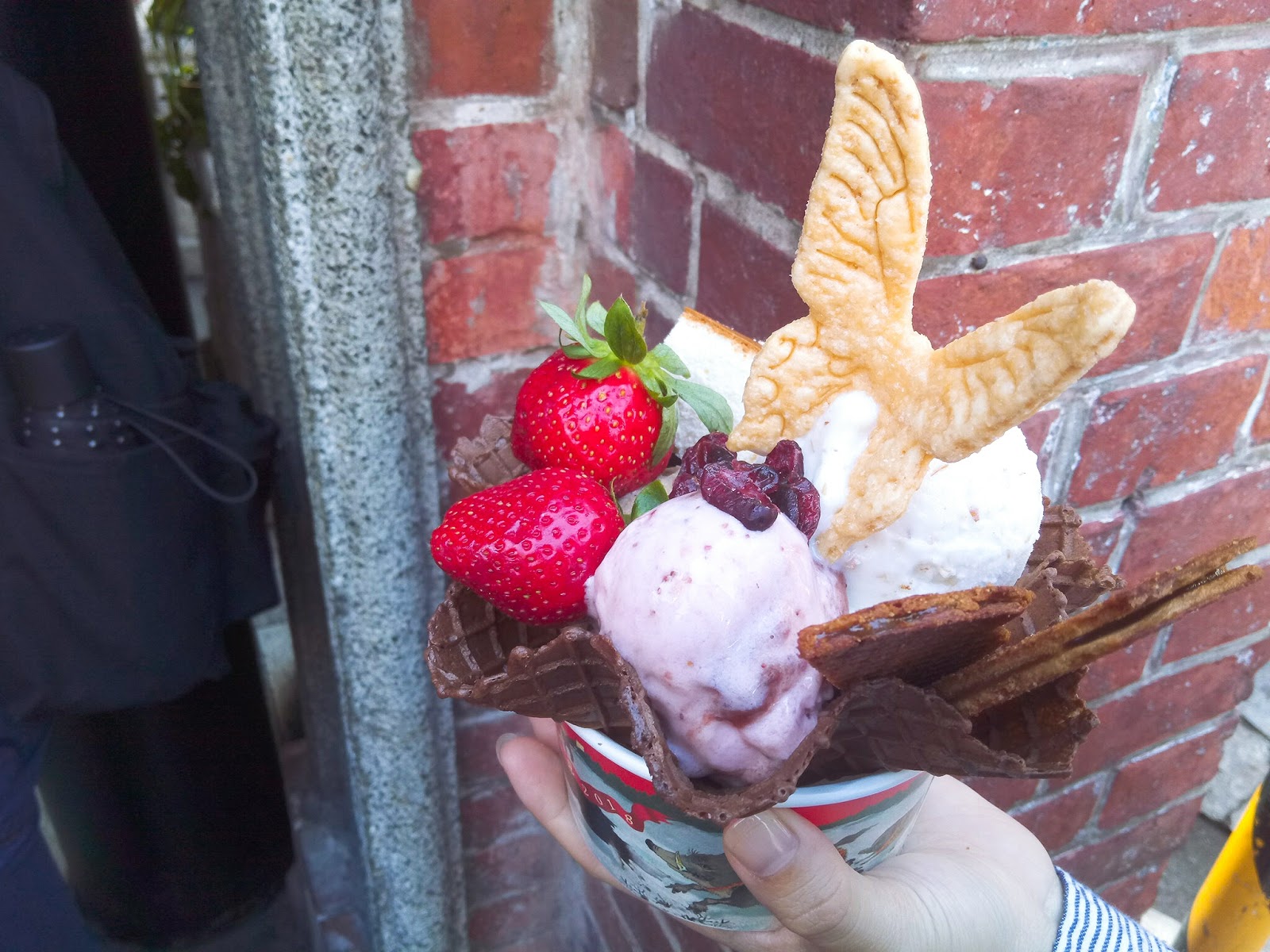 後悔這麼晚才吃到它,真心不騙超好吃(或許是我們點的口味剛好就是平常自己都很愛的口味,而且看似很長的排隊隊伍,其實速度算快的,三十分鐘左右就買到,重點是一直有在前進的感覺😄,加八十元可升級聖代會比單吃冰淇淋不無聊,配料小點也很豐富居然還有鳳梨酥,個人偏愛蝴蝶餅、起士蛋糕跟荷蘭餅就選了這三樣配料。