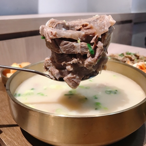 米白色的牛肉高湯是主角,非濃稠的濃湯而是比較稀的清湯,湯頭其實頗清淡,但店員有附一小疊的黑胡椒粒和鹽巴,若覺得味道不夠,可加一點黑胡椒粒到湯裡,或直接夾牛肉片去沾鹽巴或黑胡椒粒,有這兩種調味料加持,有更加分的效果