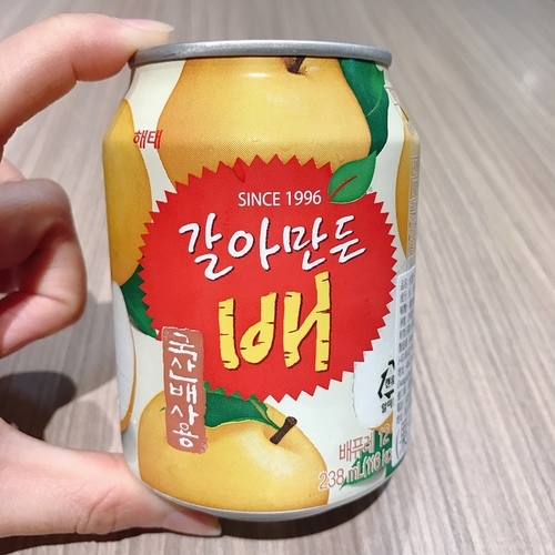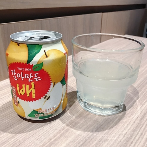 是鋁罐裝的果汁,自行倒進玻璃杯中,聞起來有甜甜的水梨香,喝起來竟也是水梨香氣,細看有綿密的水梨果肉,因果肉打得細脆無須咀嚼,只會輕輕滑過舌尖和喉腔,整體喝起來很順口!