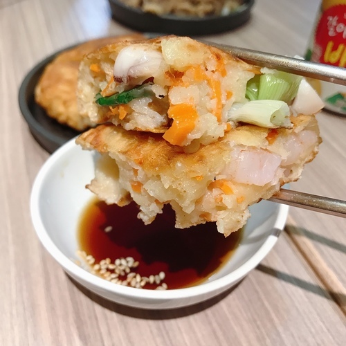很厚的海鮮煎餅!裡面餡料有整隻完整的蝦仁和花枝呢!可惜外層沒有煎到酥硬,若有金黃外皮,帶點酥脆和焦香感會更加分~